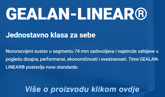 Bilo da se radi o novogradnji ili obnovi starih objekata, GEALAN-LINEAR® impresionira svojom svestranošću. Sveobuhvatna platforma sustava uključuje prozore, ulazna i klizna vrata. Sustav se može proširiti inovativnom tehnologijom lijepljenja STV®.